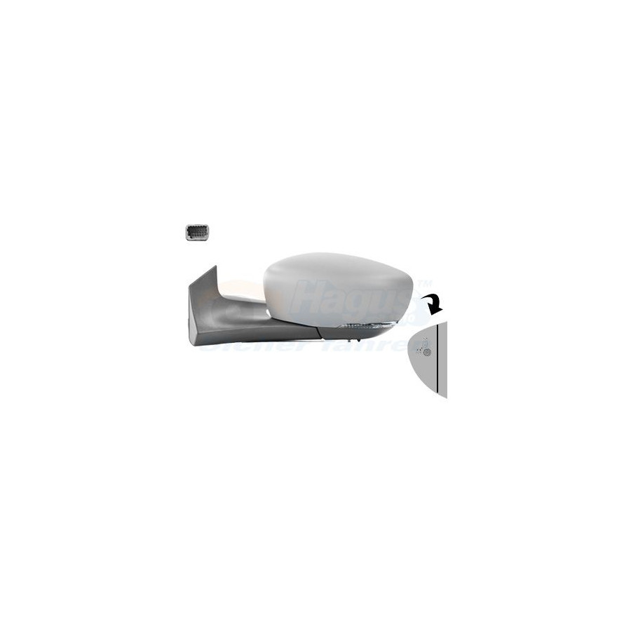 Fitting Position Left (passenger side) Surface Primed Outer/Inner Mirror Complete Mirror Spherical For electric mirror adjustment Electronically foldable Heatable Performance For vehicles with lane assist Paired article numbers 4365828 Number of connectors 1 Quality Hagus Light Function With flashing light (LED) Number of used contacts 10 Guarantee 2 years Number of contacts 12 -