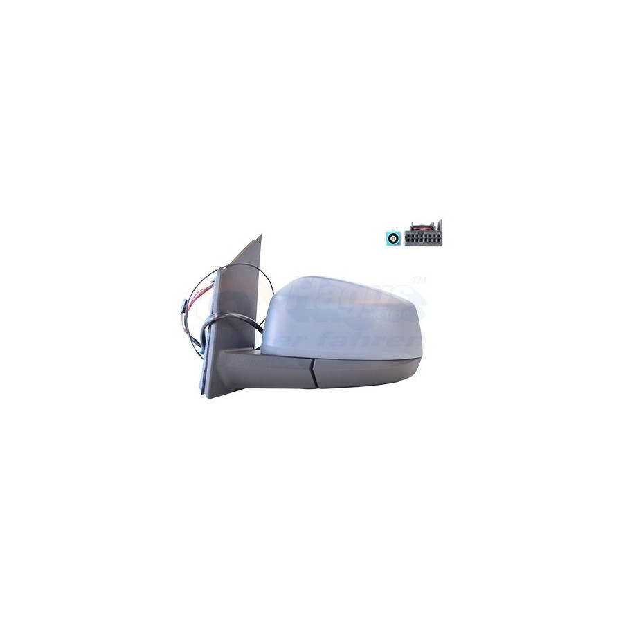 Fitting Position Left (passenger side) Surface Primed Outer/Inner Mirror Complete Mirror For electric mirror adjustment Electronically foldable Heatable With antenna Paired article numbers 5707826 Number of connectors 2 Quality Hagus Number of used contacts 8 Guarantee 2 years Number of contacts 17 Similar products of other manufacturers