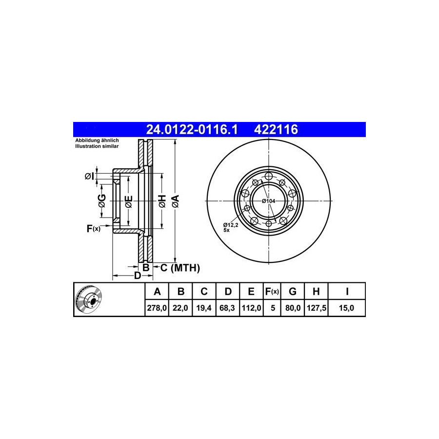 Outer diameter [mm] 278,0 Brake Disc Type Vented Surface Coated Number of Holes 5 Montage Front Brake pads Exclusive Inner diameter [mm] 127,5 Bolt Hole Circle Ø [mm] 112,0 Centering Diameter [mm] 80,0 Bore Ø [mm] 15,0 Inspection Tag E1 90R-02C0115 / 0419 MAPP code available Guarantee 2 years Height [mm] 68,3 Brake disc thickness (mm) 22,0 Minimum thickness (mm) 19,4 Similar products of other manufacturers