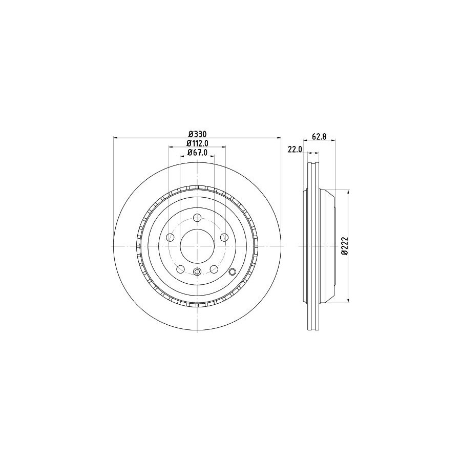 Outer diameter [mm] 330 Surface Coated Brake pads Exclusive Bolt Hole Circle Ø [mm] 112 Brake Disc Type Ventilated outside Centering Diameter [mm] 67 Hole Arrangement / Number 05/07 Machining High-carbon Guarantee 2 years Height [mm] 62,8 Additional information Without wheel hub Without wheel studs Assy./disassy. by qualified personnel required! Brake disc thickness (mm) 22 Minimum thickness (mm) 19,4 Weight [kg] 8,1 Similar products of other manufacturers