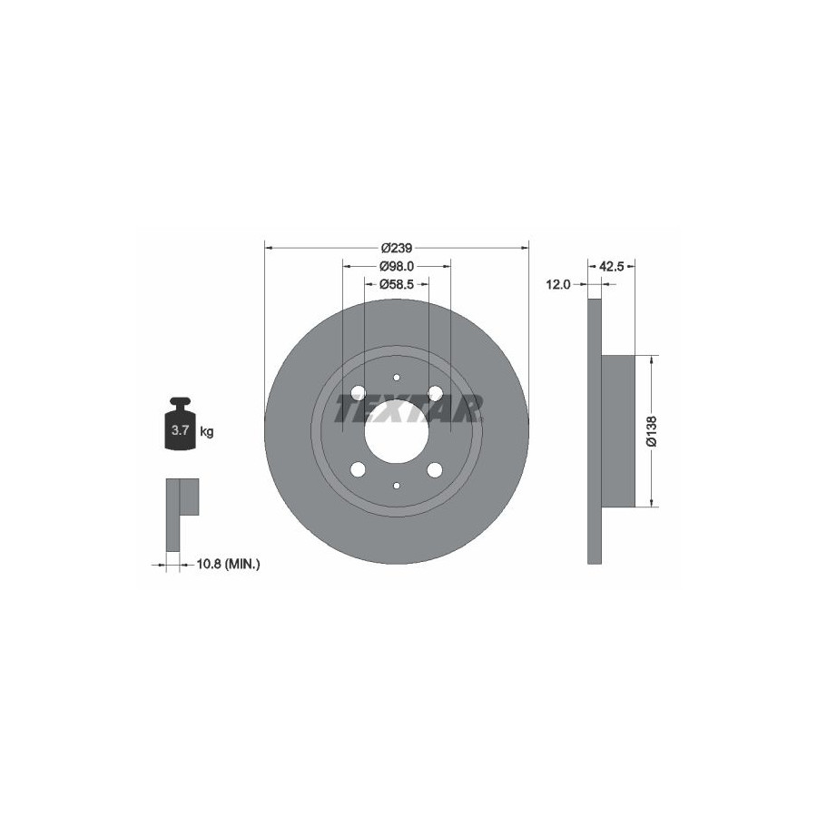 Outer diameter [mm] 239 Brake Disc Type Solid Surface No coating Brake pads Exclusive Inner diameter [mm] 125 Bolt Hole Circle Ø [mm] 98 Centering Diameter [mm] 58,5 Hole Arrangement / Number 04/06 Packaging length [cm] 24,8 Packaging width [cm] 24,8 Packaging height [cm] 10,5 Guarantee 2 years Height [mm] 42,5 Additional information Without wheel hub Without wheel bearing Without wheel studs Brake disc thickness (mm) 12 Minimum thickness (mm) 10,8 Weight [kg] 3,7 Hole diameter for wheel bolt [inch] 13 Similar products of other manufacturers