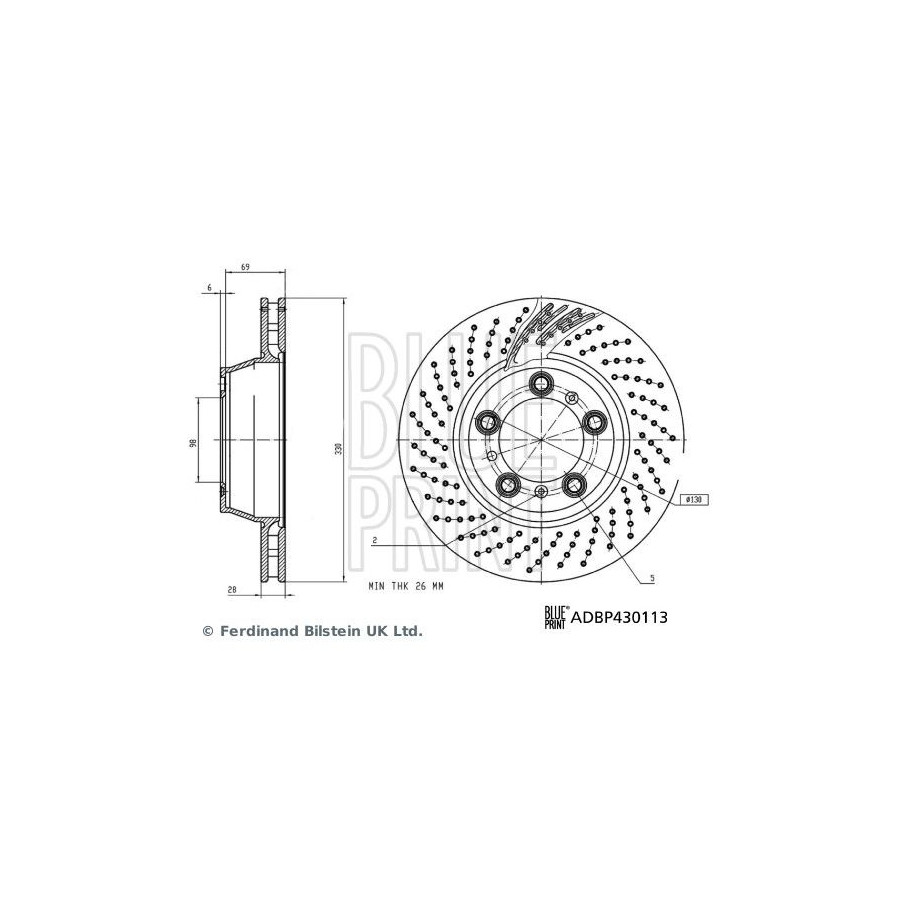 Outer diameter [mm] 330 Fitting Position Rear Axle Left Rim Hole Number 5 Surface Coated Number of mounting bores 2 Brake pads Exclusive Paired article numbers ADBP430114 Bolt Hole Circle Ø [mm] 130 Brake Disc Type Perforated/internal ventilation Observe service information Centering Diameter [mm] 98 Guarantee 2 years Thickness [mm] 75 Brake disc thickness (mm) 28 Minimum thickness (mm) 26 Similar products of other manufacturers