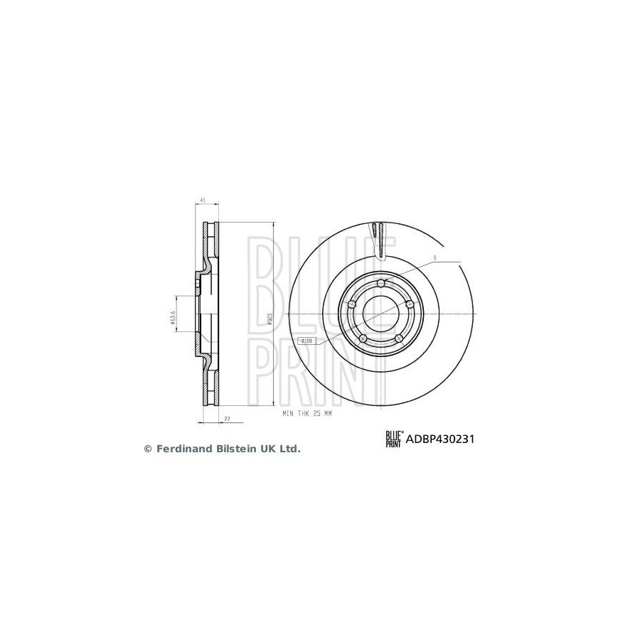 Outer diameter [mm] 325 Fitting Position Front Axle Rim Hole Number 5 Brake Disc Type Internal ventilation Surface Coated Brake pads Exclusive Bolt Hole Circle Ø [mm] 108 Centering Diameter [mm] 63,6 Guarantee 2 years Thickness [mm] 41 Brake disc thickness (mm) 27 Minimum thickness (mm) 25 -