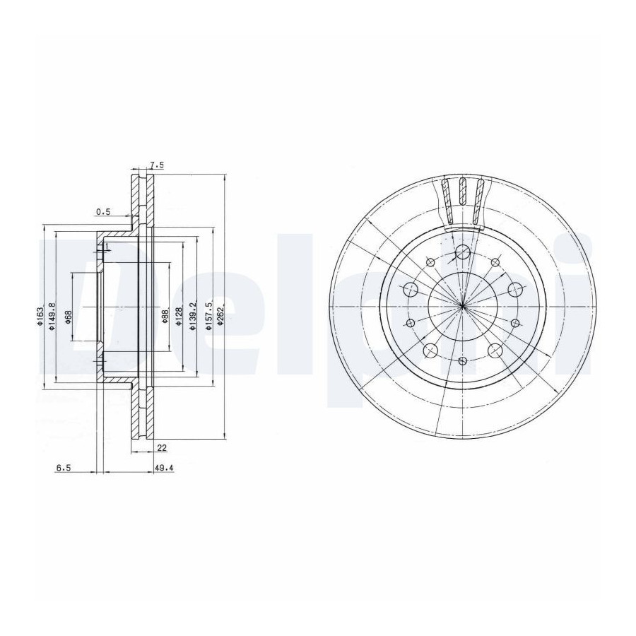 Outer diameter [mm] 263 Fitting Position Front Axle Brake Disc Type Vented Surface No coating Oiled Number of Holes 5 Brake pads Exclusive Centering Diameter [mm] 68 Inspection Tag E1 90R-02C0074/1600 Guarantee 2 years Height [mm] 56 Brake disc thickness (mm) 22 Minimum thickness (mm) 20 Similar products of other manufacturers