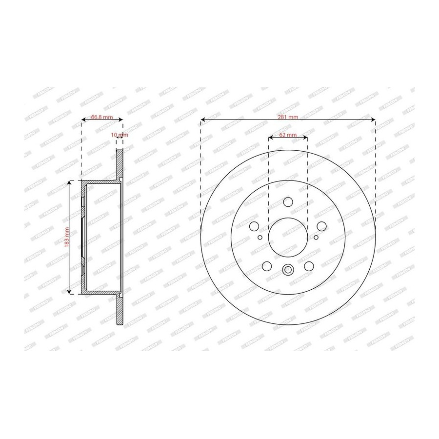 Outer diameter [mm] 281 Fitting Position Rear Axle Brake Disc Type Solid Surface Coated Number of Holes 5 Brake pads Exclusive Bolt Hole Circle Ø [mm] 114,3 Packing Type Box Centering Diameter [mm] 62 Quantity Unit Kit Packaging length [cm] 30 Packaging width [cm] 30 Packaging height [cm] 15,2 Inspection Tag R90 Homologated Guarantee 2 years Height [mm] 66,8 Brake disc thickness (mm) 10 Minimum thickness (mm) 8,5 Weight [kg] 9,33 -
