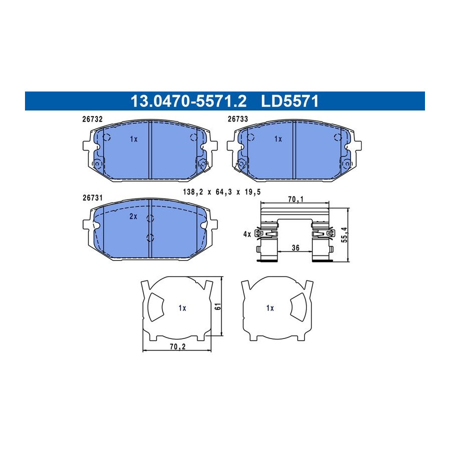 Manufacturer Manufacturer number Price ATE 13.0470-5571.2 (this product) ATE 13.0460-5571.2 BELACO BPD2507 BLUE PRINT ADG04278 DON PCP2255 FEBI BILSTEIN 16816 HERTH+BUSS JAKOPARTS J3600567 Manufacturer Manufacturer number Price ICER 182473 MINTEX MDB4330 PAGID T4241N R BRAKE RB2473 SWAG 91 91 6816 TEXTAR 2673101 -
