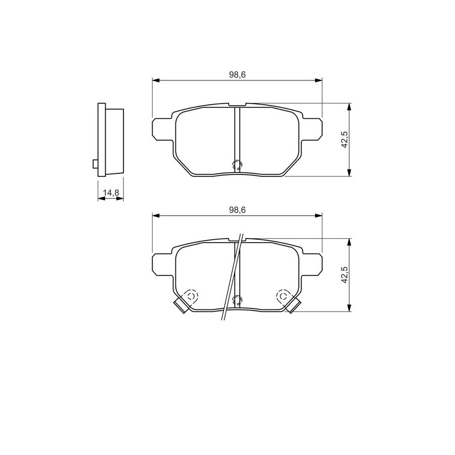 Wear Warning Contact With acoustic wear warning Content Set (4 brake pads per axle) Montage Rear Material Low-Metallic Part number of recommended accessories 1 987 474 312 1 987 474 484 1 987 474 470 WVA Number 24610 Inspection Tag ECE-R90 Guarantee 2 years Height [mm] 42,5 Width [mm] 98,6 Thickness [mm] 14,8 Product must be determined by vehicle or engine Similar products of other manufacturers