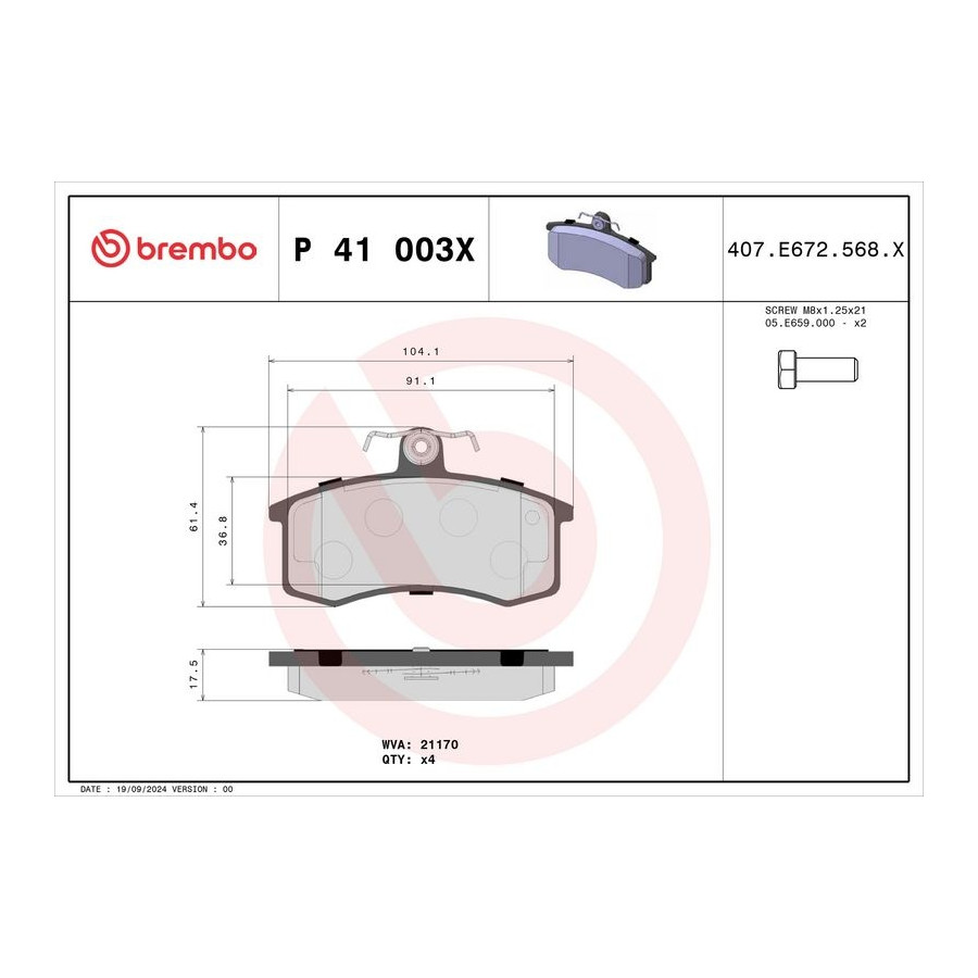 Manufacturer Manufacturer number Price A.B.S. 36576 ASHIKA 50-00-045 ATE 13.0460-2965.2 BARUM BA2040 BOSCH 0 986 491 700 BOSCH 0 986 494 533 BOSCH 0 986 495 214 BREMBO P 41 003X (this product) BREMSI BP2333 CHAMPION 571346CH DELPHI LP551 DENCKERMANN B111048 DON PCP1047 Dr!ve+ DP1010.10.1165 FERODO FDB527 HERTH+BUSS JAKOPARTS J3601075 JAPANPARTS PA-045AF JAPKO 50045 Manufacturer Manufacturer number Price KAVO PARTS KBP-1025 MAGNETI MARELLI 363700541003 MASTER-SPORT 13046029652-SET-MS MASTER-SPORT 13046029652C-SET-MS MASTER-SPORT 13046029652E-SET-MS MASTER-SPORT 13046029672-SET-MS MASTER-SPORT 13046029672E-SET-MS MINTEX MDB1353 OPTIMAL BP-09448 REMSA 0221.02 ROADHOUSE 2221.02 ROTINGER RT 2PD05510 TEXTAR 2117002 TRW GDB469 VALEO 302640 VALEO 301406 VALEO 301406A WOKING P3213.02 -