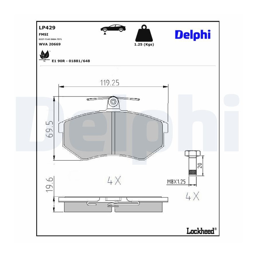 Fitting Position Front Axle braking System TRW Wear Warning Contact Without wear indicator Width 1 [mm] 119,3 Width 2 [mm] 119,3 Content Set (4 brake pads per axle) Supplementary Article/Info 2 With anti-squeak plate Supplementary Article/Supplementary Info With accessories Wear Warning Contact Not prepared for wear warning WVA Number 20669 Inspection Tag E1 90R-01881/648 Guarantee 2 years Thickness 1 [mm] 19,6 Thickness 2 [mm] 19,6 Clutch Liner Material Low-Metallic Height 1 [(mm) 69,5 Height 2 (mm) 69,5 FMSI code D227-7143 D684-7571 Similar products of other manufacturers