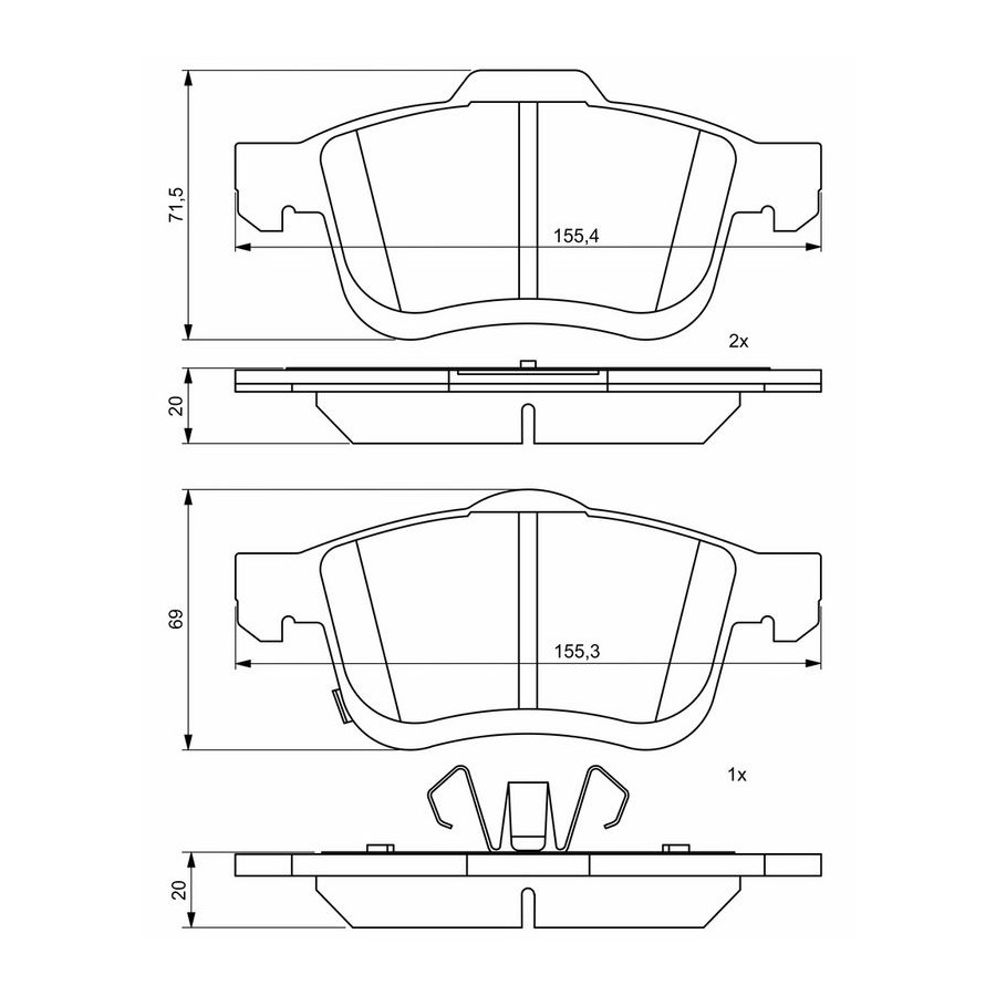 Wear Warning Contact Without wear indicator With integrated wear warning contact Width 1 [mm] 155,4 Width 2 [mm] 156,4 Content Set (4 brake pads per axle) Material Low-Metallic Supplementary Article/Info 2 With piston clip With anti-squeak plate Part number of recommended accessories 1 987 474 433 WVA Number 25905 Inspection Tag ECE-R90 Guarantee 2 years Thickness [mm] 20,2 Height 1 [(mm) 69 Height 2 (mm) 71,4 Product must be determined by vehicle or engine Similar products of other manufacturers
