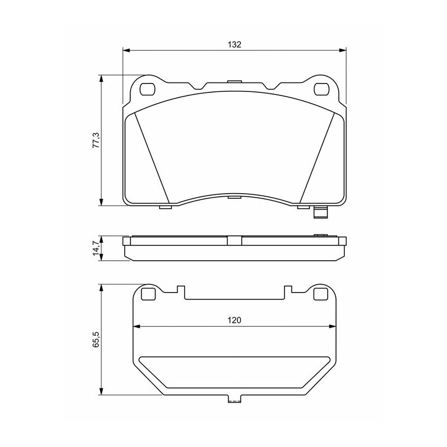 Wear Warning Contact With acoustic wear warning Incl. wear warning contact Content Set (4 brake pads per axle) Material Low-Metallic Supplementary Article/Info 2 With anti-squeak plate Part number of recommended accessories 1 987 474 680 1 987 474 454 WVA Number 23092 Inspection Tag ECE-R90 Guarantee 2 years Height [mm] 77,3 Width [mm] 132 Thickness [mm] 14 Product must be determined by vehicle or engine Similar products of other manufacturers