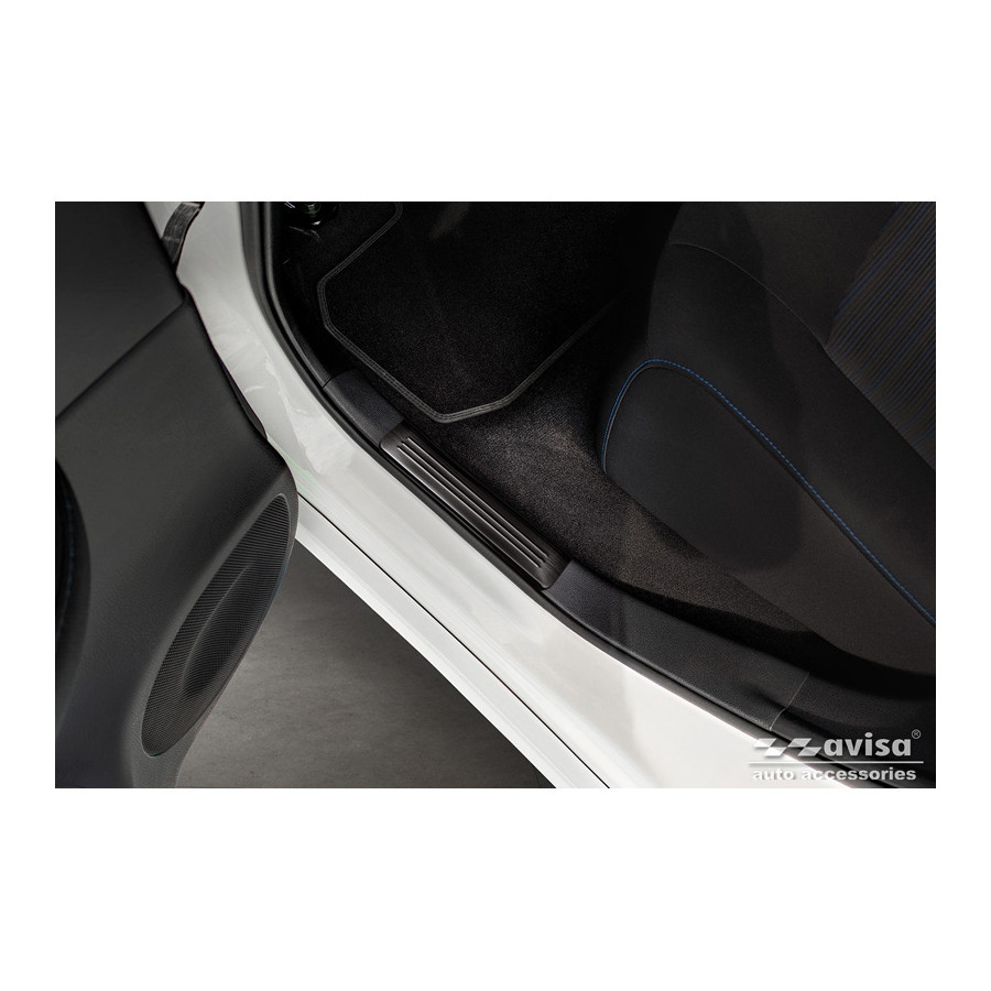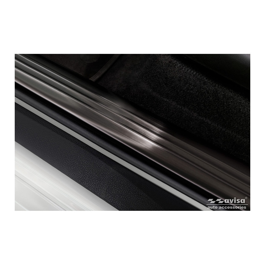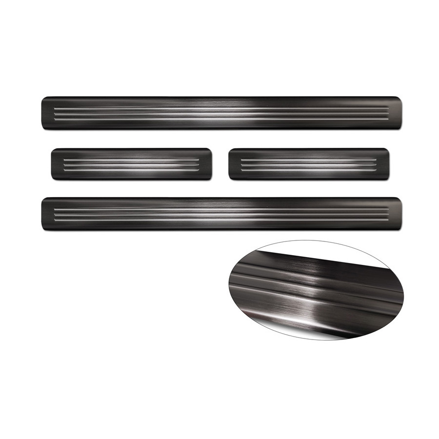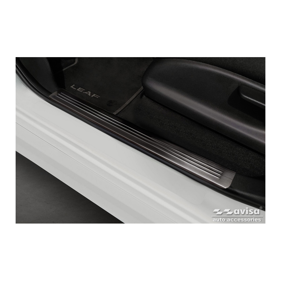 Black Stainless Steel Door Sill Trims Suitable for Nissan Leaf II 2017- - 'Lines' - Set of 4. Door sill trims are the ultimate accessories for protecting your car's sills and adding a luxurious look. These are custom-made for your car, ensuring a perfect fit. They prevent scratches and damage while getting in and out and protect against the elements. With a wide selection of materials and designs, you can give your car a unique look. These door sill trims are easy to attach with the included 3M tape. Specifications: Additional Information: Die-cut lines. Contents: Set of 4 for both front and rear doors. Color: Black. Material: Stainless steel.