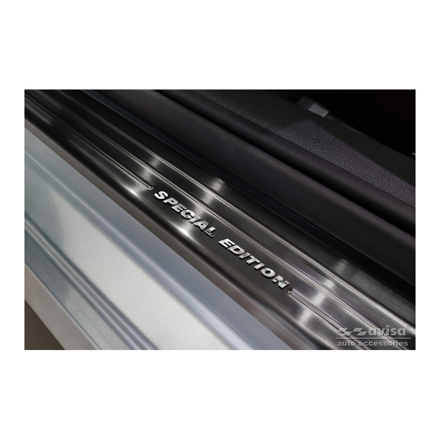 Black Stainless Steel Door Sill Trims Suitable for Skoda Fabia IV Hatchback 2021 - 'Special Edition' - Set of 4. Door sill trims are the ultimate accessories for protecting your car's sills and adding a luxurious look. These are custom-made for your car, ensuring a perfect fit. They prevent scratches and damage while getting in and out and protect against the elements. With a wide choice of materials and designs, you can give your car a unique look. These door sill trims are easy to attach using the included 3M tape. Specifications: Die-cut lines and chrome-printed 'Special Edition' logo. Contents: Set of 4 for both front and rear doors. Color: Black. Material: Stainless steel.