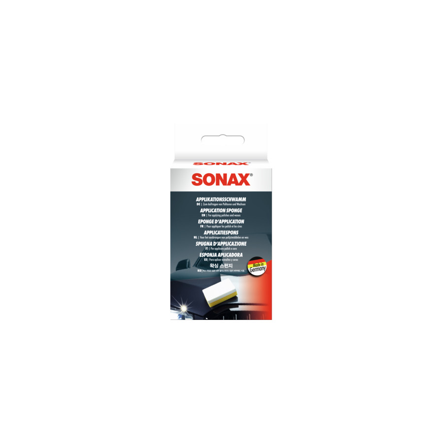 SONAX Application Sponge for evenly and thoroughly applying polishes and waxes. Special sponge with a white side for enhanced grip and a yellow side with an extra-fine texture. Universally applicable for applying and distributing polishes, waxes, and exterior plastic care products.
