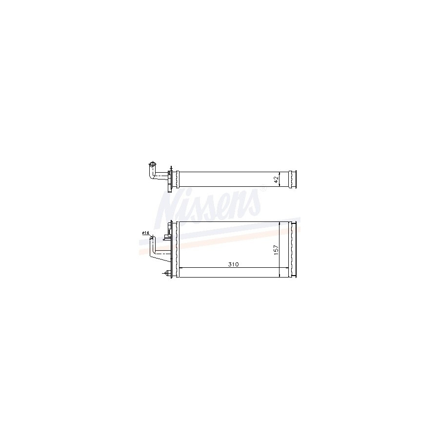 Guarantee 2 years Radiator type Mechanically jointed cooling fins Cooling Fins Material Aluminium Material tank (radiator) Plastic Core Length [mm] 310 Core Width [mm] 157 Core Depth [mm] 42 Exhaust diameter [mm] 16 Output diameter [mm] 16 Similar products of other manufacturers