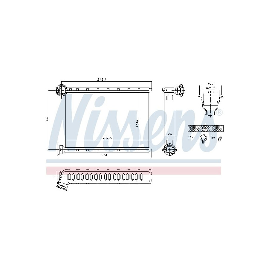 Supplementary Article/Supplementary Info With pipe Guarantee 2 years Radiator type Soldered cooling fins Cooling Fins Material Aluminium Material tank (radiator) Aluminium Core Length [mm] 134 Core Width [mm] 201 Core Depth [mm] 26 Exhaust diameter [mm] 21,2 Output diameter [mm] 21,2 Similar products of other manufacturers