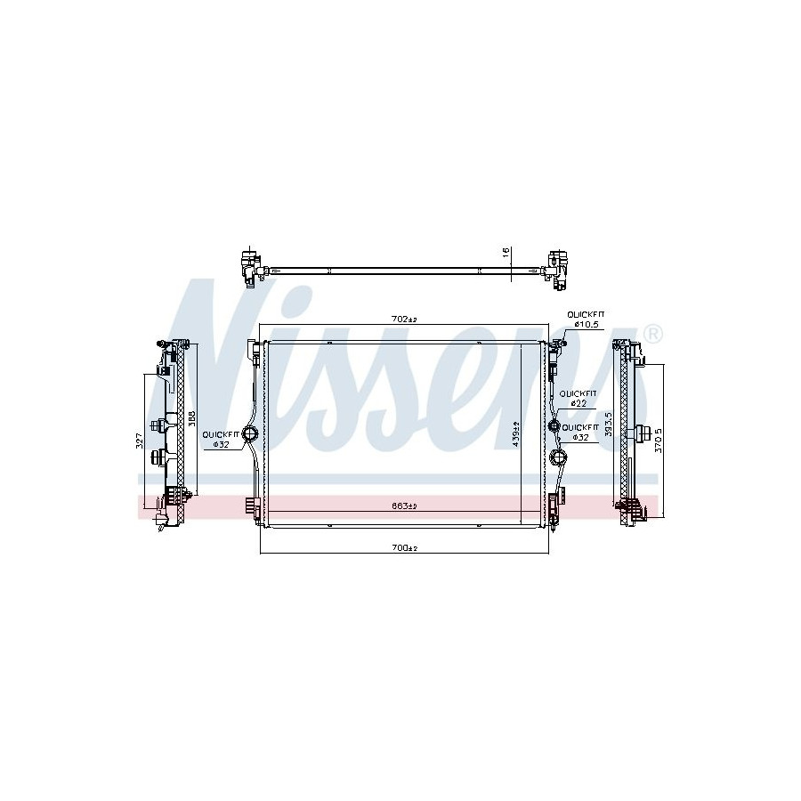 Type Radiator Core Length [mm] 663 Core Width [mm] 439 Guarantee 2 years Radiator type Soldered cooling fins Cooling Fins Material Aluminium Material tank (radiator) Plastic Core Depth [mm] 16 Exhaust diameter [mm] 32,5 Output diameter [mm] 32,5 -