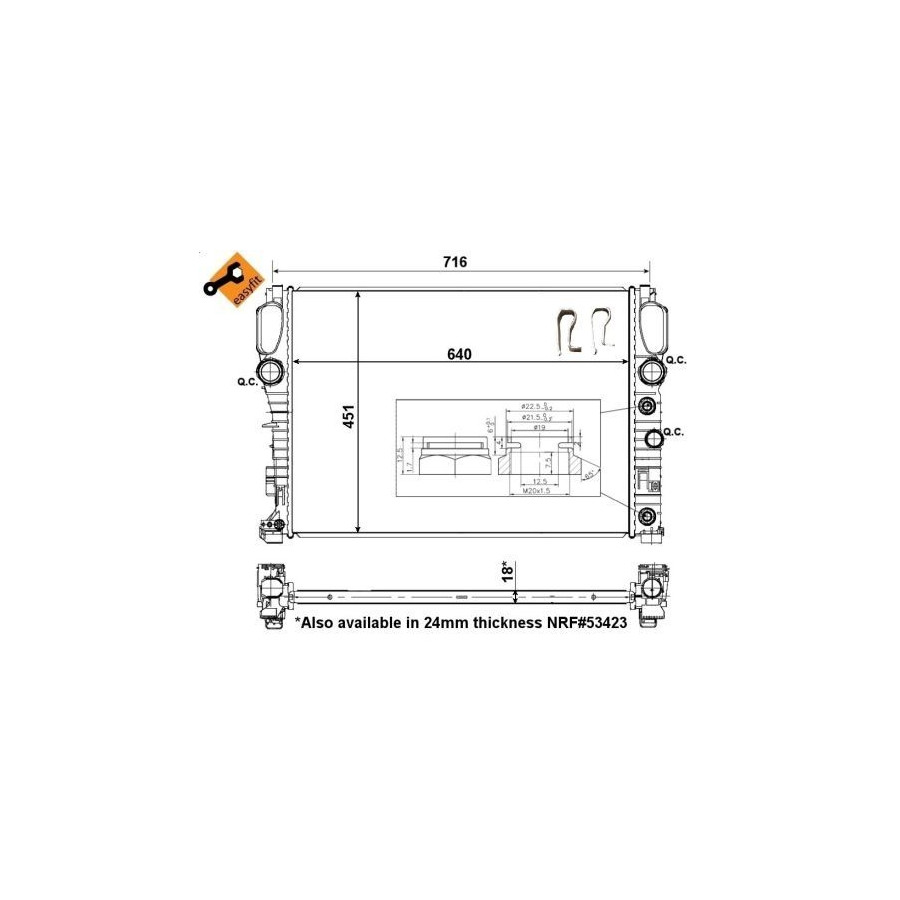Type Radiator Core Length [mm] 640 Core Width [mm] 451 Material Aluminium Supplementary Article/Info 2 With seal Heating / Cooling For vehicles with combined radiator/ oil cooler Guarantee 2 years Radiator type Soldered cooling fins Core Depth [mm] 18 Similar products of other manufacturers