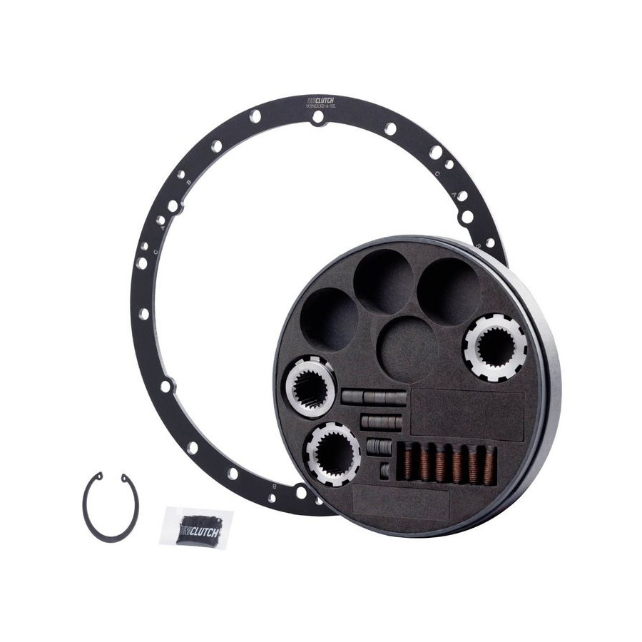 The UniClutch vehicle mounting kit includes a Multi-Fit flywheel mount, transmission spline set, and a 12.9-grade bolt set. Suitable for 240mm UniClutch.