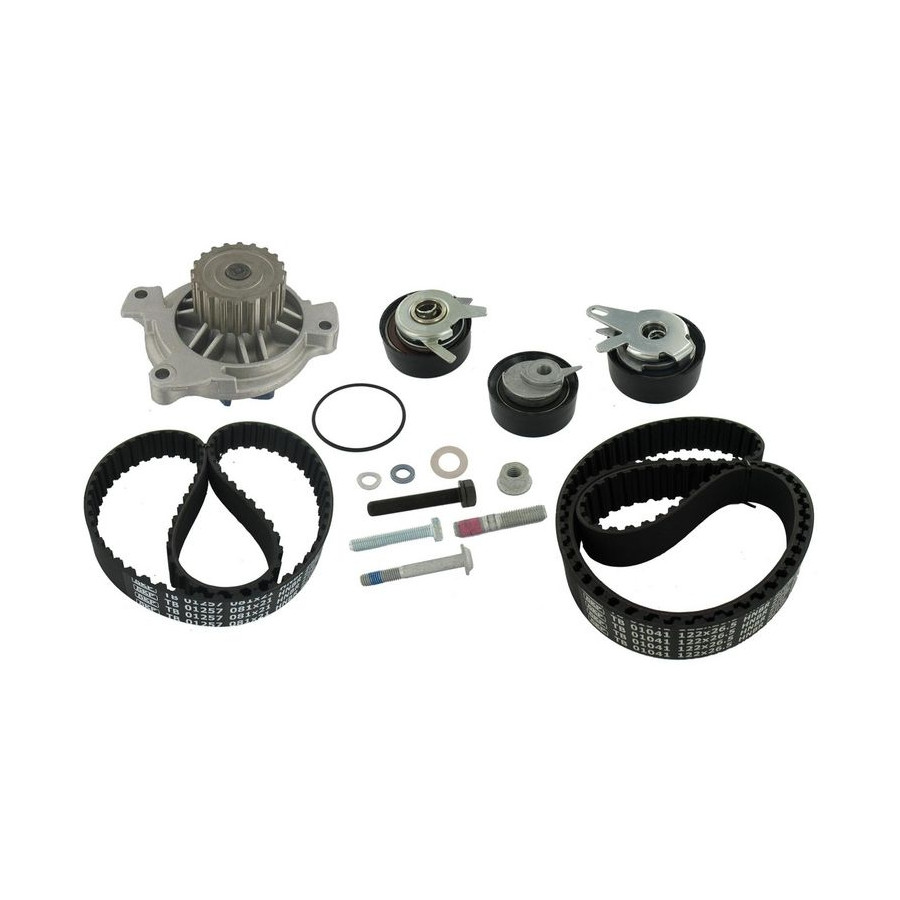 Number of Teeth 1 122 Number of Teeth 2 81 application Timing belt Distribution Set Including water pump Supplementary Article/Info 2 With studs Supplementary Article/Supplementary Info With gaskets/seals Width 1 [mm] 26,5 Belts With trapezoidal tooth profile Width 2 [mm] 21 Number of screws 3 Guarantee 2 years Material water pump impeller Sheet Steel Similar products of other manufacturers