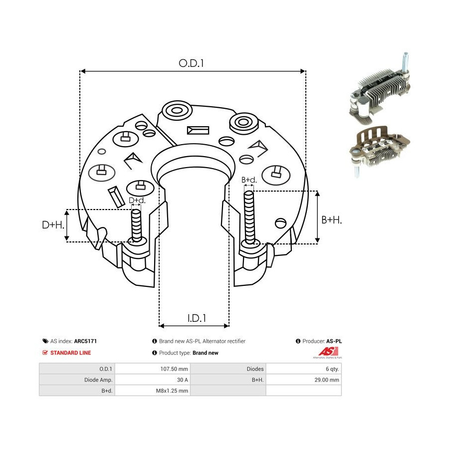 Outer diameter [mm] 107,50 Quality Standard line Guarantee 2 years Number of diodes 6 Current [A] 30 New part without deposit Similar products of other manufacturers