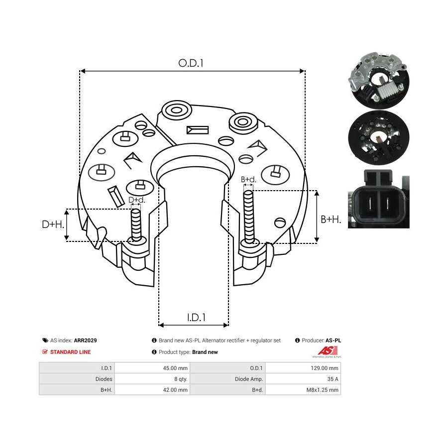 Outer diameter [mm] 129,00 Inner diameter [mm] 45,00 Quality Standard line Guarantee 2 years Number of diodes 8 Current [A] 35 New part without deposit -
