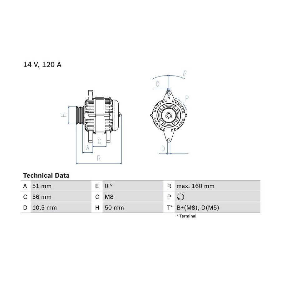 Voltage [V] 14 Alternator Charge Current [A] 120 Belt Pulley Ø [mm] 50 Number of grooves 6 Pulleys With multi-belt pulley Distance from pulley to alternator [mm] 51 Rotation Direction Clockwise rotation Clamp B+(M8),D(M5) Alternator type Excl. vacuum pump Recommended additional repairs V-Belt/V-Ribbed Belt Guarantee 2 years Method of attachment Double Pivot Lever Length [mm] 160 Refurbished item Similar products of other manufacturers