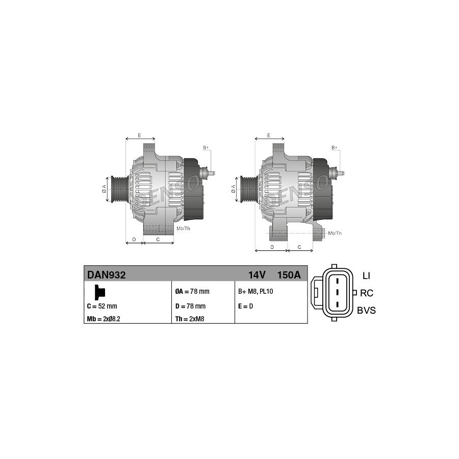 Voltage [V] 14 Alternator Charge Current [A] 150 Belt Pulley Ø [mm] 78 Pulleys With belt pulley Quality Denso Vehicle Main Current For vehicles with a 12-volt electrical system Guarantee 2 years Gross weight [g] 6270 New part without deposit Similar products of other manufacturers
