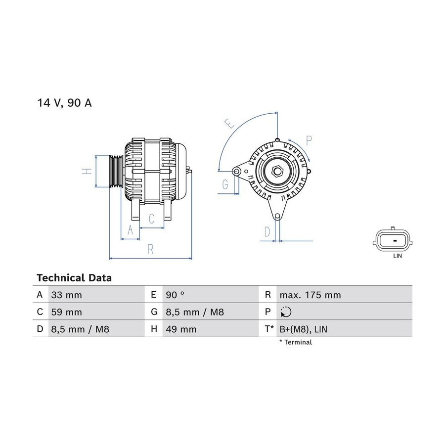 Voltage [V] 14 Alternator Charge Current [A] 90 Belt Pulley Ø [mm] 49 Number of grooves 7 Pulleys With freewheel belt pulley Distance from pulley to alternator [mm] 33 Rotation Direction Clockwise rotation Plug Type ID PL381 Alternator type Excl. vacuum pump Recommended additional repairs V-Belt/V-Ribbed Belt Guarantee 2 years Method of attachment Double Pivot Lever Length [mm] 175 Refurbished item Similar products of other manufacturers