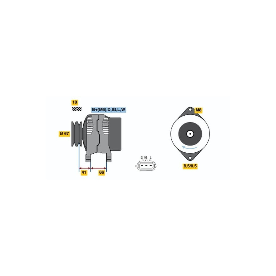 Voltage [V] 14 Alternator Charge Current [A] 55 Belt Pulley Ø [mm] 67,1 Number of grooves 2 Pulleys With double pulley Rotation Direction Clockwise rotation Alternator type Excl. vacuum pump Recommended additional repairs V-Belt/V-Ribbed Belt Guarantee 2 years Method of attachment Double Pivot Lever Length [mm] 178 Similar products of other manufacturers