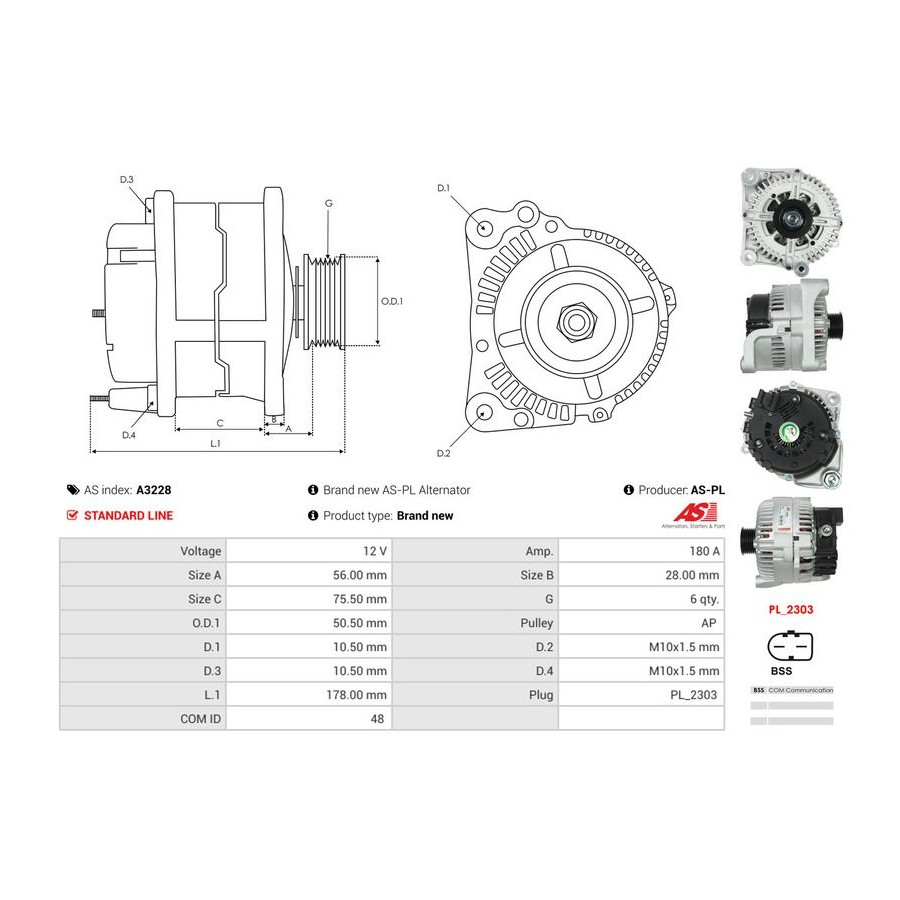 Voltage [V] 12 Alternator Charge Current [A] 180 Pulleys With belt pulley for OE number TG17C027 Quality Standard line Guarantee 2 years New part without deposit Similar products of other manufacturers