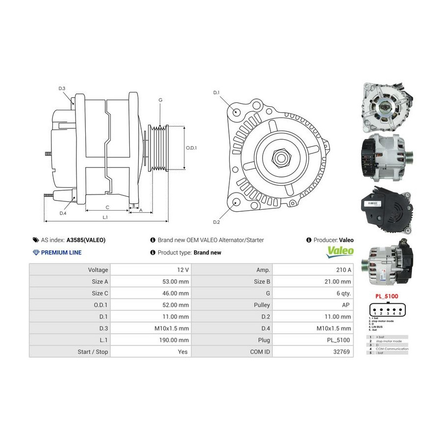Voltage [V] 12 Alternator Charge Current [A] 210 Pulleys With belt pulley for OE number 439864 Quality PREMIUM LINE Guarantee 2 years New part without deposit -