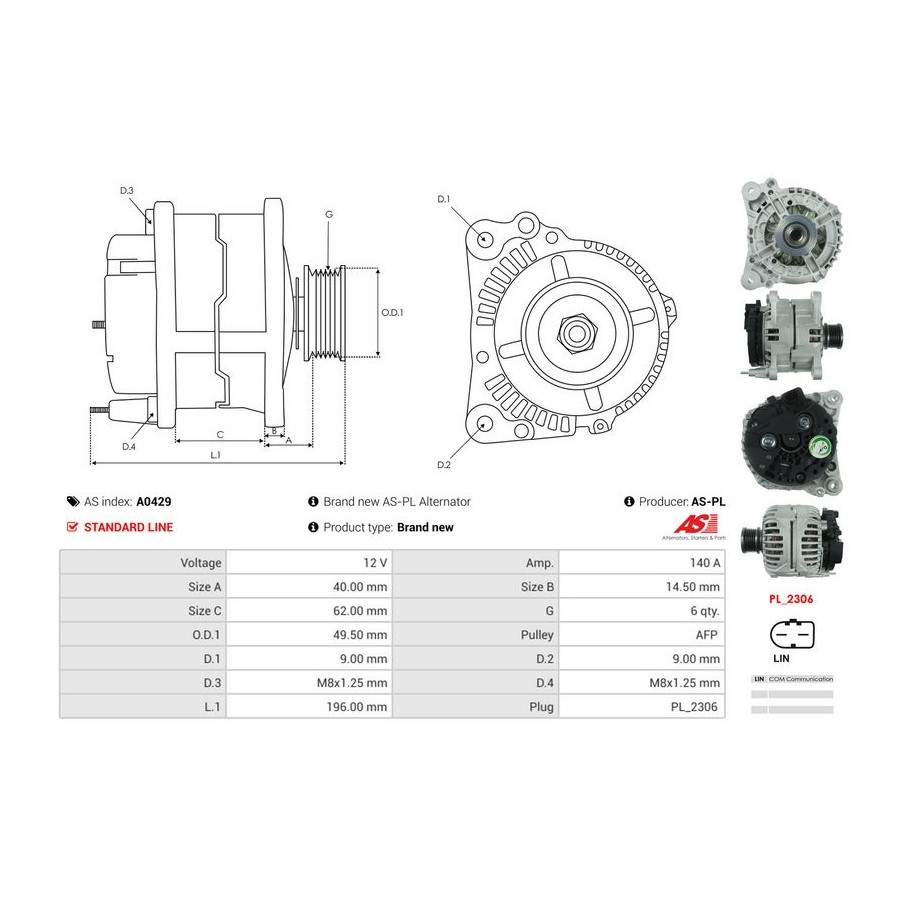 Manufacturer Manufacturer number Price AES 205.519.140.010 AES 205.519.140.280 AS-PL A0429 (this product) AS-PL A0429 BORG & BECK BBA3039 BTS Turbo G107735 BTS Turbo G107733 BTS Turbo G107734 CASCO CAL10379AS CASCO CAL10379GS CEVAM 4662 CV PSH 205.519.140.014 CV PSH 205.519.140.010 CV PSH 205.519.140.211 CV PSH 205.519.140.346 CV PSH 205.519.140.280 DA SILVA 011806 DA SILVA MAQ0422 DA SILVA JA011806 ELTA AUTOMOTIVE EZ4208 ERA 210706A ERA 210706 FEBI BILSTEIN 188354 FEBI BILSTEIN 1003674 FISPA A12BH0257AS Manufacturer Manufacturer number Price FISPA A12BH0073AS FISPA A12BH0257 HC-Cargo F 032 116 359 HELLA 8EL 012 430-791 HERTH+BUSS ELPARTS 32081340 HOFFER H5510545 HOFFER H5510545G HOFFER H5515170 MEAT & DORIA 5515170 MEAT & DORIA 5510545 MEAT & DORIA 5510545G PRESTOLITE ELECTRIC A2003B SIDAT A12BH0073AS SIDAT A12BH0257 SIDAT A12BH0257AS VALEO 439791 VALEO 200238 VALEO 440428 VALEO 443152 VALEO 440864 VALEO 440208 WAI 20305N WILMINK GROUP WG2196892 WILMINK GROUP WG2471615 -