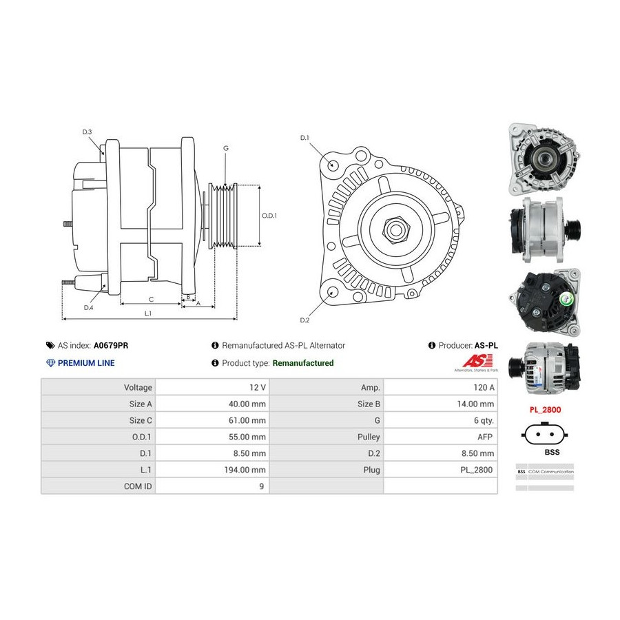 Voltage [V] 12 Alternator Charge Current [A] 120 Pulleys With freewheel belt pulley Quality PREMIUM LINE Guarantee 2 years Replacement part without deposit Similar products of other manufacturers