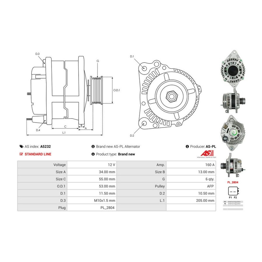Voltage [V] 12 Alternator Charge Current [A] 160 Pulleys With freewheel belt pulley for OE number A2TX0281 Quality Standard line Guarantee 2 years New part without deposit Similar products of other manufacturers