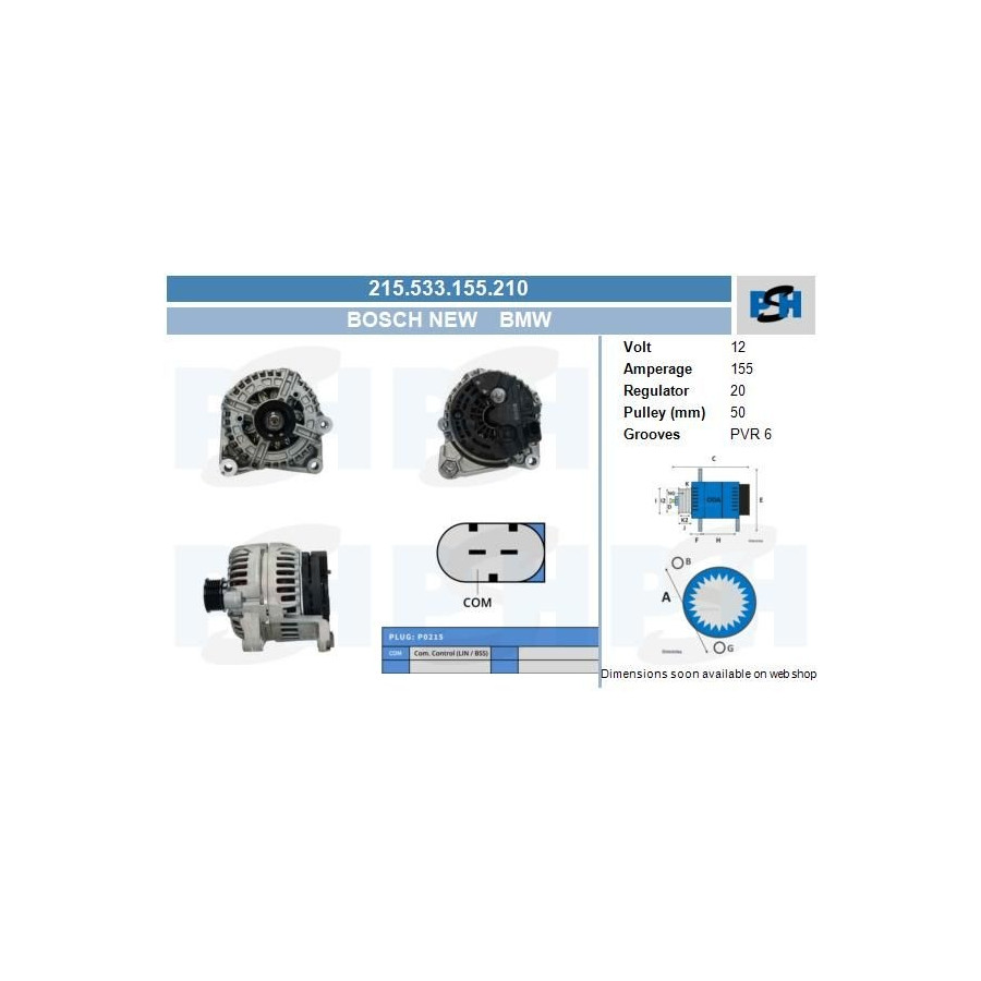 Voltage [V] 12 Alternator Charge Current [A] 155 Belt Pulley Ø [mm] 50 Number of grooves 6 Quality Bosch New Clamp M8 B+ Guarantee 2 years Connecting Angle [Degree] 90 -