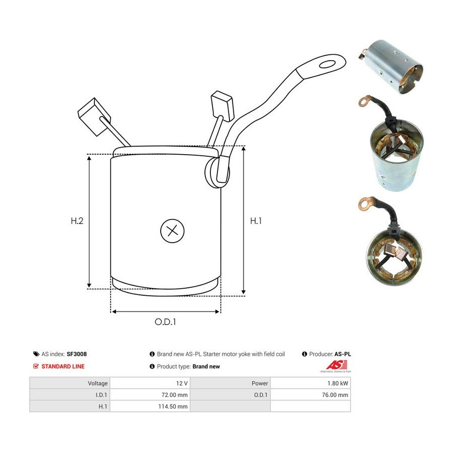 Outer diameter [mm] 76,00 Voltage [V] 12 Quality Standard line Guarantee 2 years Height [mm] 114,50 New part without deposit Starter motor power [kW] 1,8 -
