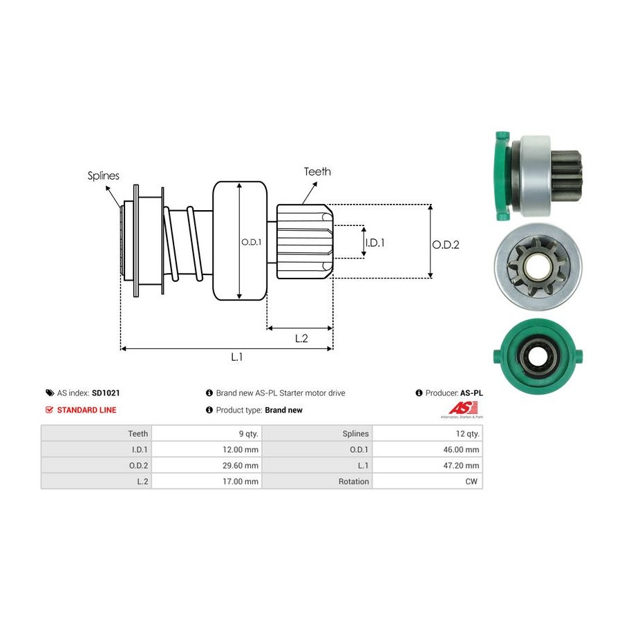 Inner diameter [mm] 12,00 Number of Teeth 9 Outer Diameter 1 [mm] 46,00 Outer diameter 2 [mm] 29,60 Quality Standard line Length 1 [mm] 47,2 Rotation Direction Clockwise rotation Guarantee 2 years New part without deposit Similar products of other manufacturers