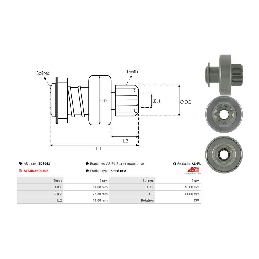 Inner diameter [mm] 11,00 Number of Teeth 9 Outer Diameter 1 [mm] 46,00 Outer diameter 2 [mm] 25,80 Quality Standard line Length 1 [mm] 41 Rotation Direction Clockwise rotation Guarantee 2 years New part without deposit -
