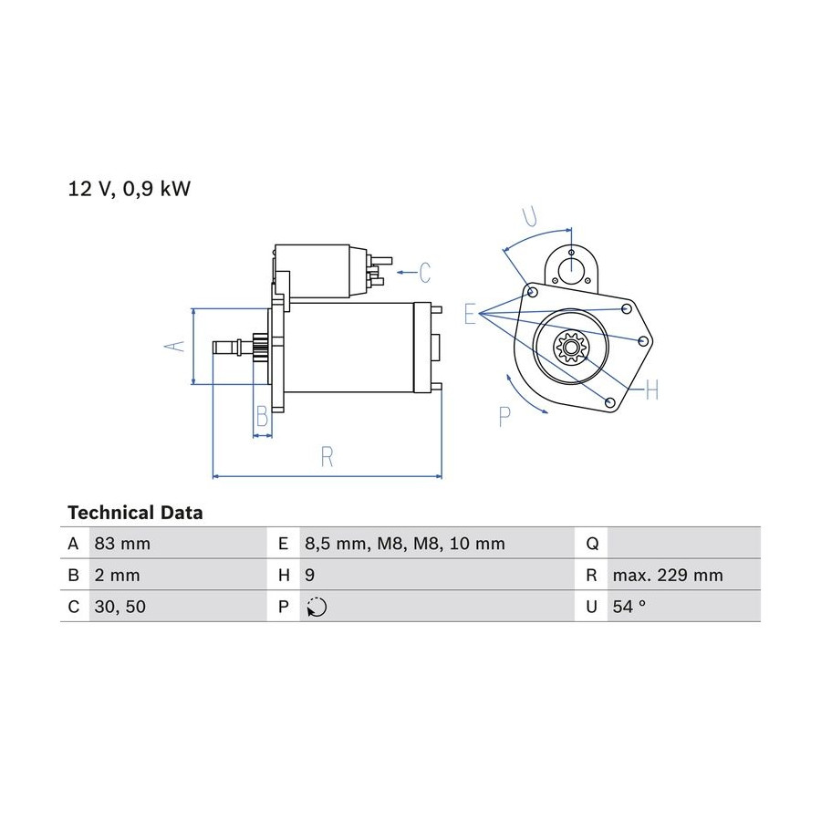 Number of Teeth 9 Rated Power [kW] 0,9 Number of mounting bores 2 Rotation Direction Clockwise rotation Voltage [V] 12 Bore Ø 4 [mm] 10 Thread Measurement 1 M8x1.25 Position / Degree Right (passenger side) Clamp 50 30 Service exchange part Thread Measurement 2 M8x1.25 Guarantee 2 years Connecting Angle [Degree] 54 Number of Thread Bores 2 Length [mm] 229 Pinion start position [mm] 1,8 starter Version With top bearing Fastening hole angle measurement [Degree] 54 Flange diameter [mm] 82,5 Hole diameter [mm] 8,5 Similar products of other manufacturers