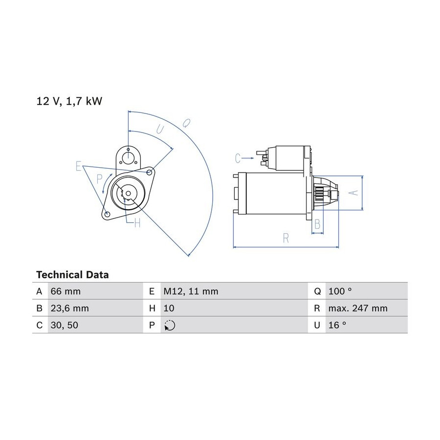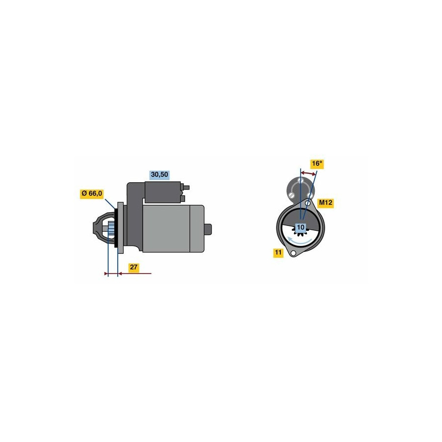 Number of Teeth 10 Rated Power [kW] 1,7 Number of mounting bores 1 Rotation Direction Clockwise rotation Voltage [V] 12 Thread Size M12x1.5 Position / Degree Right (passenger side) Clamp 30,50 Service exchange part Guarantee 2 years Connecting Angle [Degree] 16 Number of Thread Bores 1 Length [mm] 247 Pinion start position [mm] 23,6 starter Version Without top bearing Jaw opening angle measurement [Degree] 100 Fastening hole angle measurement [Degree] 16 Flange diameter [mm] 66 Hole diameter 2 [mm] 11 Similar products of other manufacturers