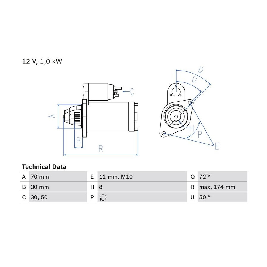 Number of Teeth 8 Rated Power [kW] 1 Number of mounting bores 1 Rotation Direction Clockwise rotation Voltage [V] 12 Thread Measurement 1 M10x1.5 Position / Degree Right (passenger side) Clamp 50 30 Service exchange part Guarantee 2 years Connecting Angle [Degree] 50 Number of Thread Bores 1 Length [mm] 174 Pinion start position [mm] 30 starter Version Without top bearing Jaw opening angle measurement [Degree] 72 Fastening hole angle measurement [Degree] 50 Flange diameter [mm] 70 Hole diameter [mm] 11 Similar products of other manufacturers