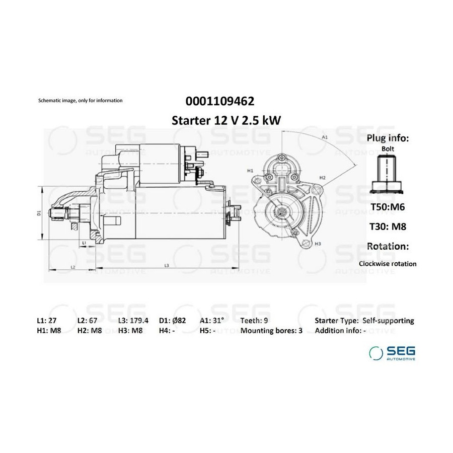 Number of Teeth 9 Number of mounting bores 3 Rotation Direction Clockwise rotation Starter motor power [kW] 2,5 Voltage [V] 12 Position / Degree R31 Clamp T50: M6; T30: M8 Plug Type ID Bolt Guarantee 2 years Length [mm] 246,4 Flange diameter [mm] 82 Similar products of other manufacturers