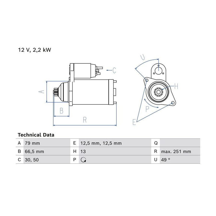 Rated Power [kW] 2,2 Number of mounting bores 2 Rotation Direction Anti-clockwise rotation Voltage [V] 12 Position / Degree Left (passenger side) Service exchange part Guarantee 2 years Connecting Angle [Degree] 49 Number of Thread Bores 0 Length [mm] 251 Pinion start position [mm] 66,5 starter Version Without top bearing (automatic) Fastening hole angle measurement [Degree] 49 Flange diameter [mm] 79 Hole diameter [mm] 12,5 Hole diameter 2 [mm] 12,5 Similar products of other manufacturers