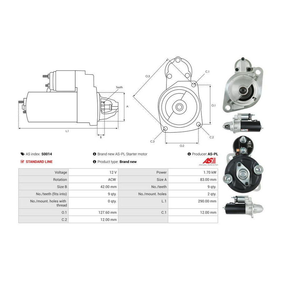 Number of Teeth 9 Rated Power [kW] 1,7 Number of mounting bores 2 Rotation Direction Anti-clockwise rotation Voltage [V] 12 for OE number 0001110009 Quality Standard line Guarantee 2 years New part without deposit Similar products of other manufacturers