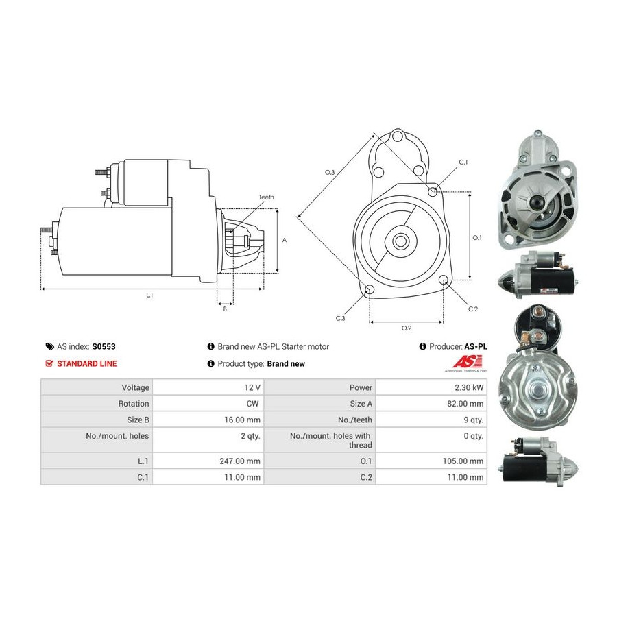 Number of Teeth 9 Rated Power [kW] 2,3 Number of mounting bores 2 Rotation Direction Clockwise rotation Voltage [V] 12 Version 0001109356 Quality Standard line Guarantee 2 years New part without deposit Similar products of other manufacturers