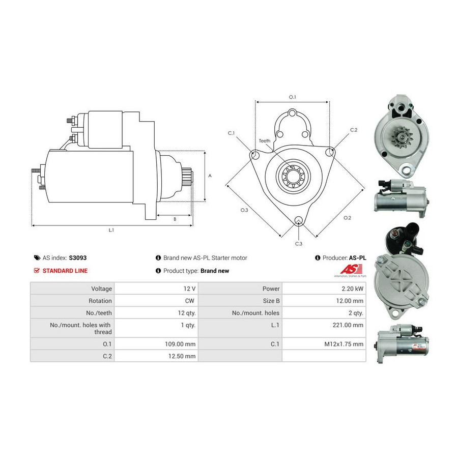 Number of Teeth 12 Rated Power [kW] 2,2 Number of mounting bores 2 Rotation Direction Clockwise rotation Voltage [V] 12 Version TS22ER12 Quality Standard line Guarantee 2 years New part without deposit Similar products of other manufacturers