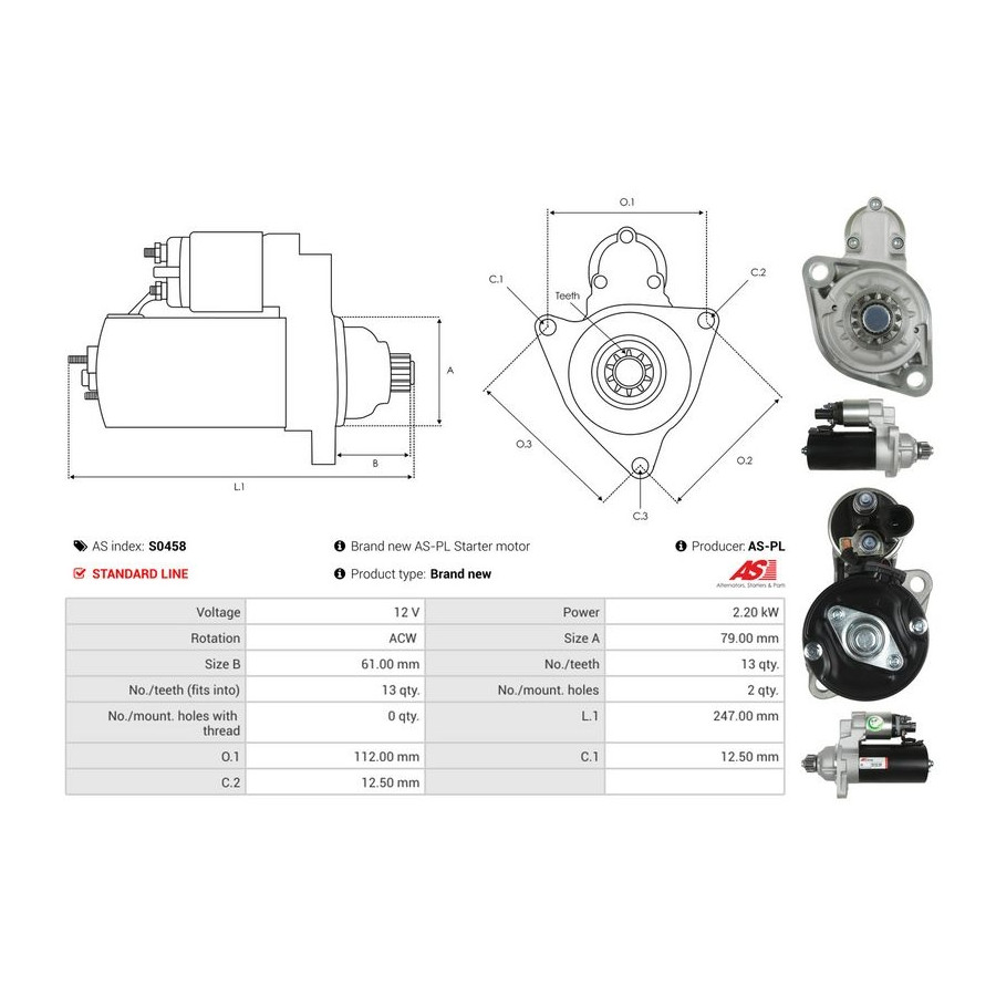 Number of Teeth 13 Rated Power [kW] 2,2 Number of mounting bores 2 Rotation Direction Anti-clockwise rotation Voltage [V] 12 Version 0001153009 Quality Standard line Guarantee 2 years New part without deposit Similar products of other manufacturers