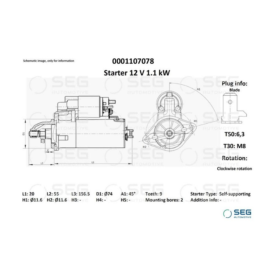 Number of Teeth 9 Rotation Direction Clockwise rotation Starter motor power [kW] 1,24 Voltage [V] 12 Position / Degree R45 Clamp T50: 6,3; T30: M8 Plug Type ID BLADE Guarantee 2 years Length [mm] 211,5 Similar products of other manufacturers