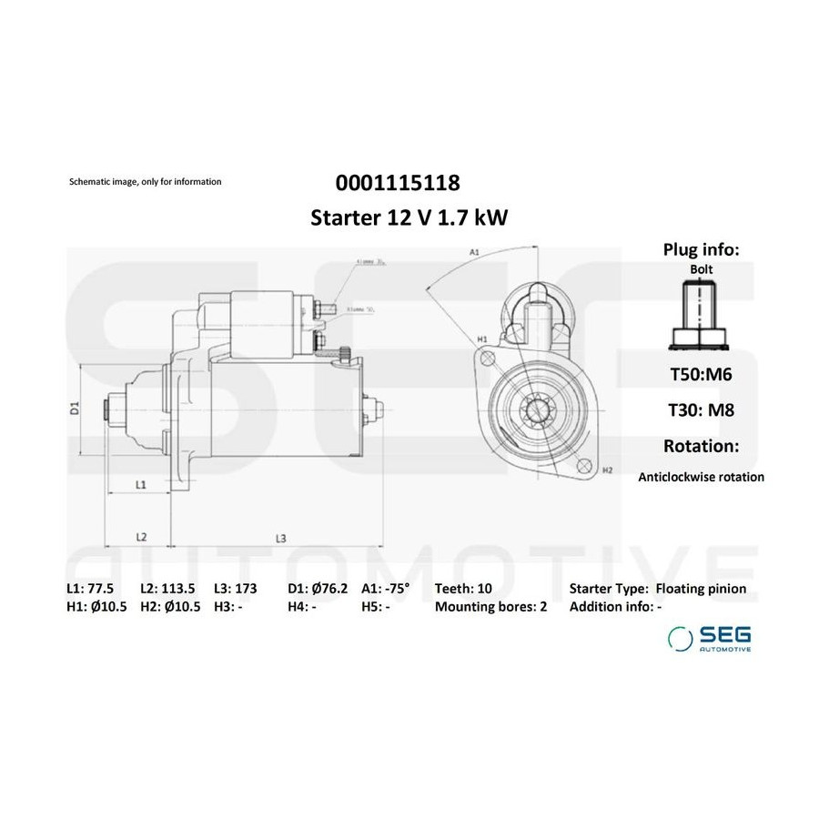 Number of Teeth 10 Rated Power [kW] 1,7 Number of mounting bores 2 Rotation Direction Anti-clockwise rotation Voltage [V] 12 Position / Degree L75 Clamp T50: M6; T30: M8 Plug Type ID Bolt Guarantee 2 years Length [mm] 286,5 Flange diameter [mm] 76 Similar products of other manufacturers